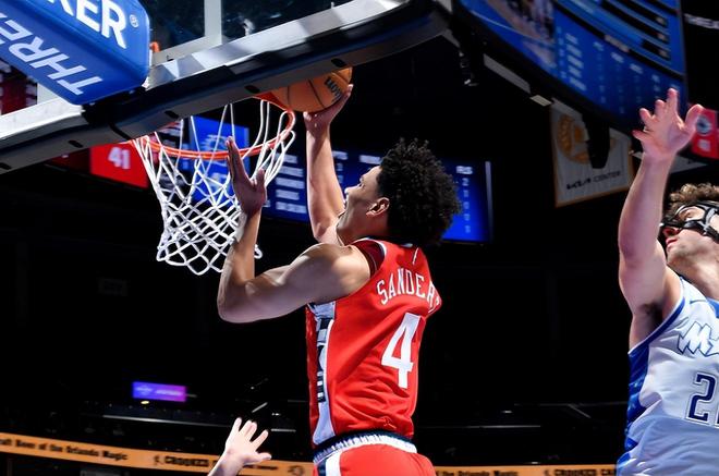 本场比赛中,快船的先发锋线新秀科比-桑德斯(Kobe Sanders)没有延续之前的好状态,表现也是出现了明显的下滑。桑德斯全场出场27分58秒,投篮8中2,三分线外4中1,罚球1中1,得到了6分2篮板2盖帽的数据,还有5次失误和4次犯规,正负值为-9。桑德斯在进攻端的效率很不理想,他并没有将自己全面的得分能力和投射能力发挥出来。桑德斯在传球和策应方面的特点也同样没有发挥出来,他还出现了大量的失误,他在技术和基本功方面似乎也没有大家想象中那么出色,他进攻端的贡献度确实是非常有限的。不过另一方面,桑德斯在防守端也是态度非常积极的,而且这样的防守态度也是起到了一定的效果。只是快船全队的表现实在是太差了,桑德斯本身的状态也比较一般,即使他在防守端很努力,也无法改变比赛的局面。